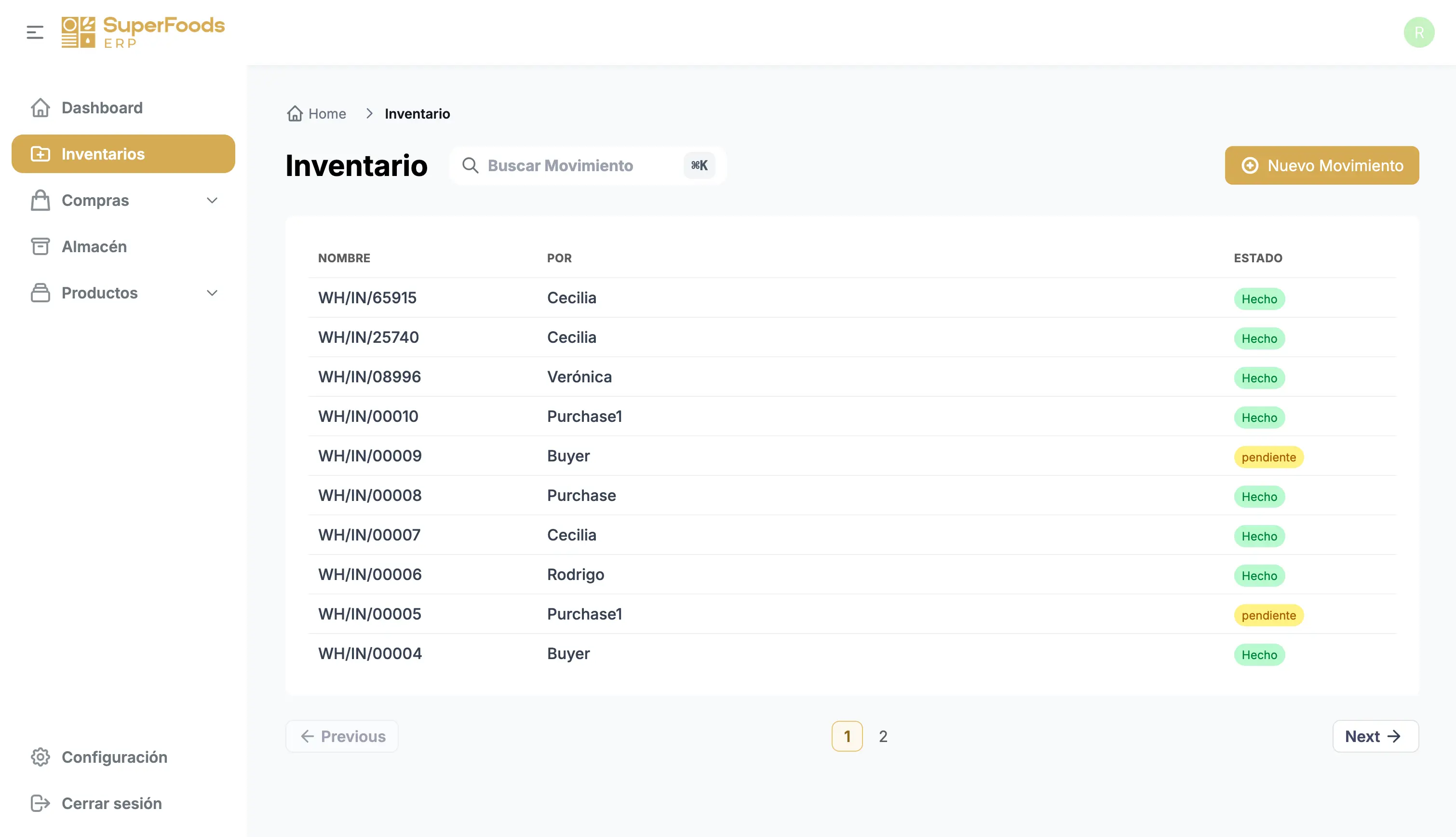 Sistema ERP a medida para Markea Foods, empresa de alimentos saludables. El sistema centraliza la operación de múltiples sucursales con módulos de inventario, compras, catálogo de productos y un robusto sistema de roles y permisos.