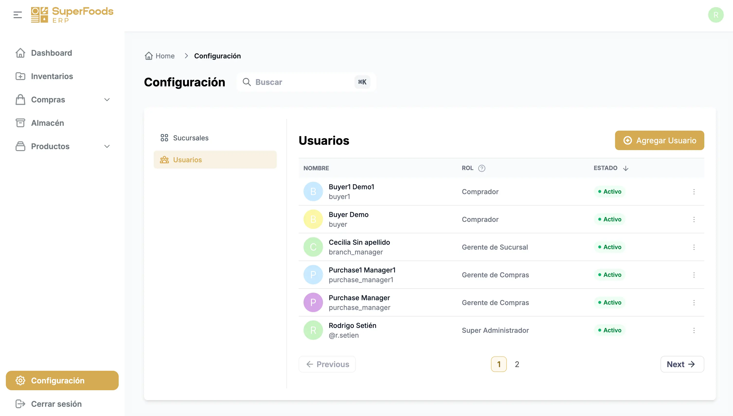 - Roles y Permisos: Administrador, Gerente de Sucursal, Gerente de Compras, Gerente de Almacén y Comprador