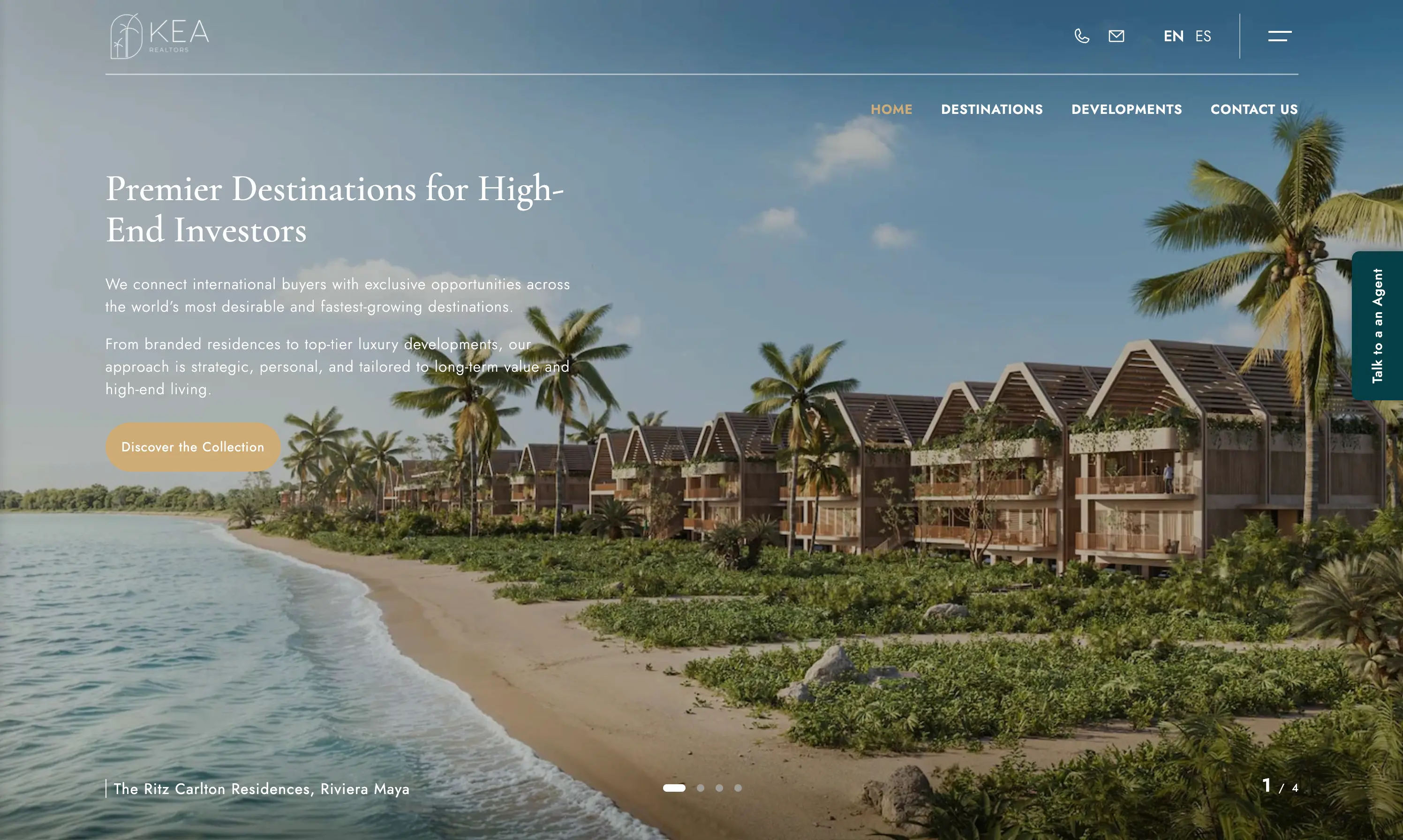 Sitio web corporativo para KEA Realtors, firma boutique especializada en propiedades residenciales de ultra-lujo. El sitio presenta más de 18 desarrollos en 9 destinos premium: Cancún, Miami, Tulum, Dubai y más.