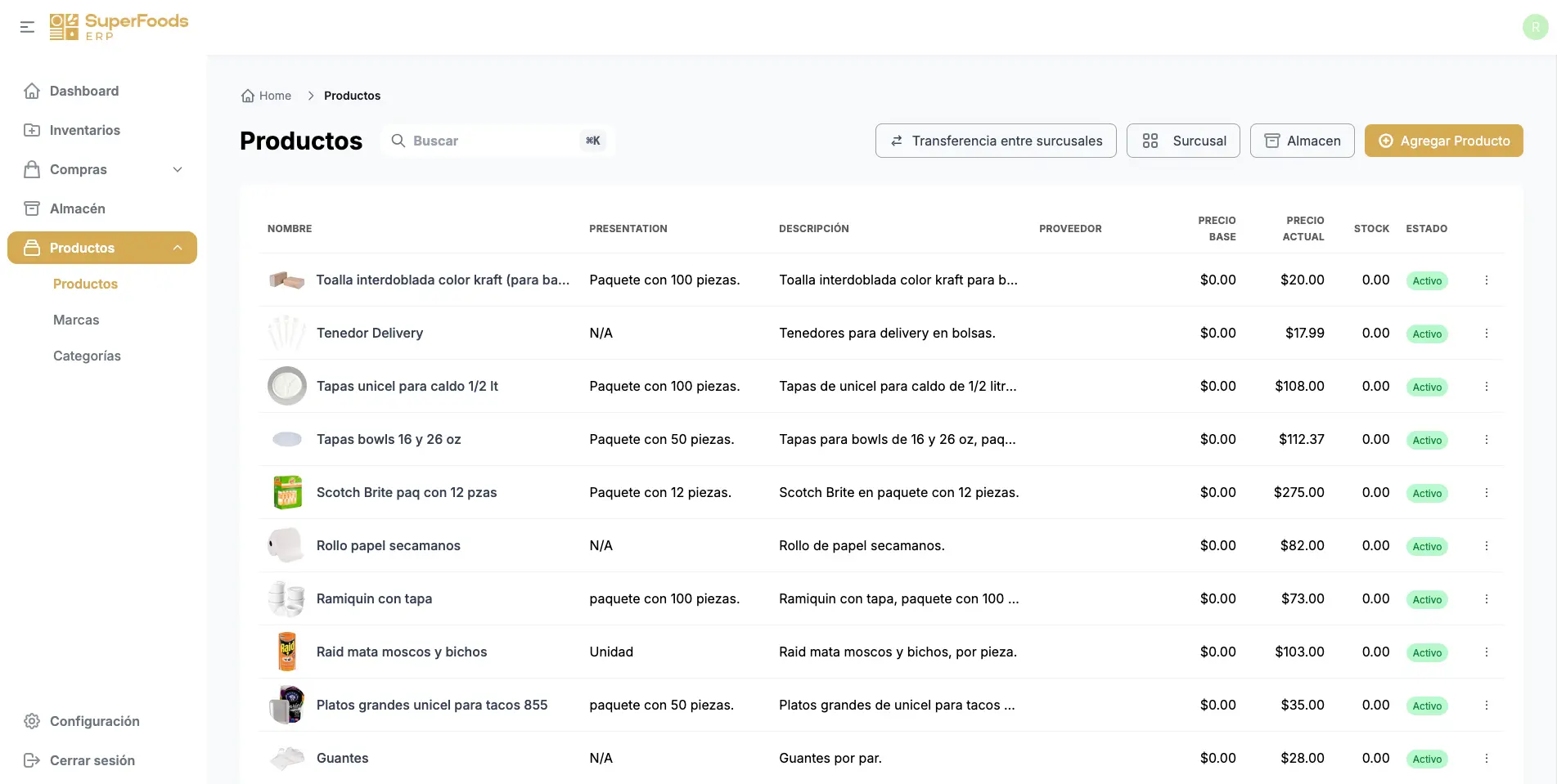 Sistema ERP a medida para Markea Foods, empresa de alimentos saludables. El sistema centraliza la operación de múltiples sucursales con módulos de inventario, compras, catálogo de productos y un robusto sistema de roles y permisos.