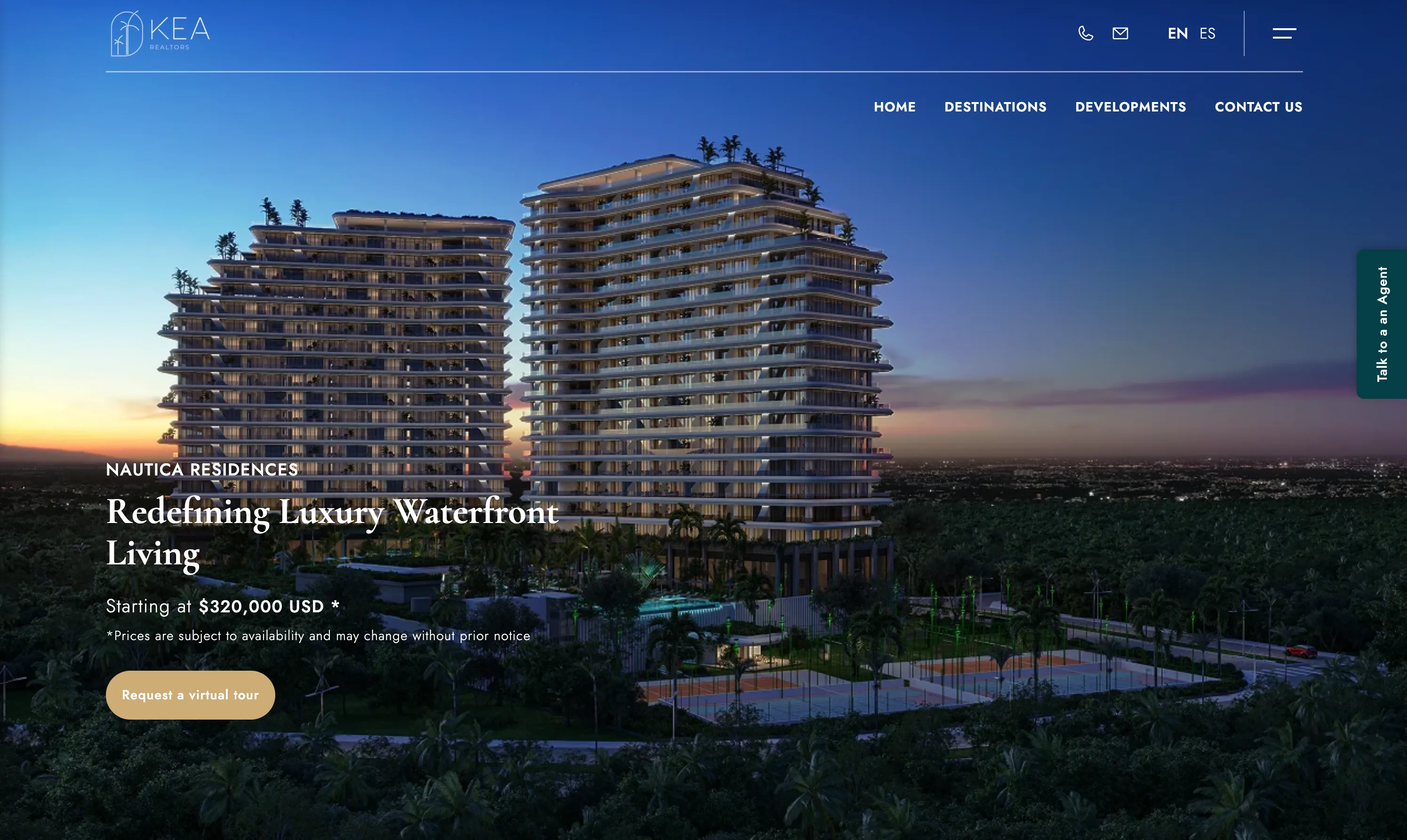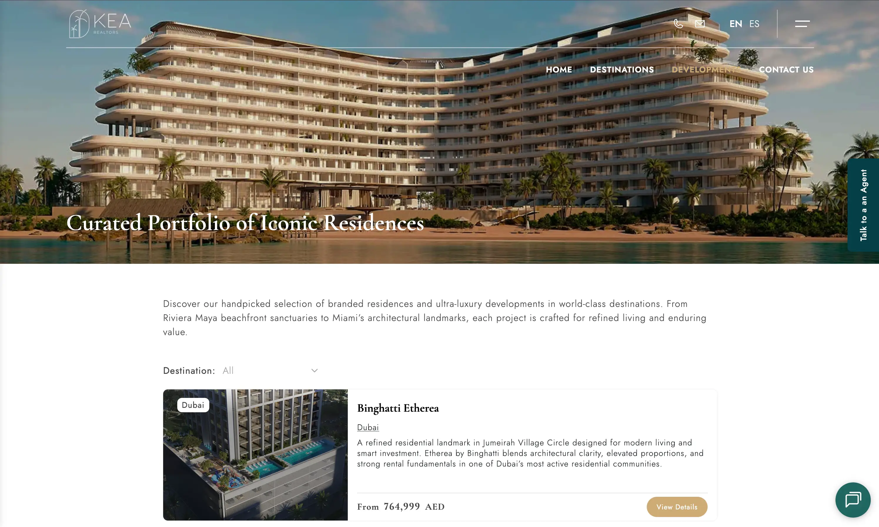 Sitio web corporativo para KEA Realtors, firma boutique especializada en propiedades residenciales de ultra-lujo. El sitio presenta más de 18 desarrollos en 9 destinos premium: Cancún, Miami, Tulum, Dubai y más.